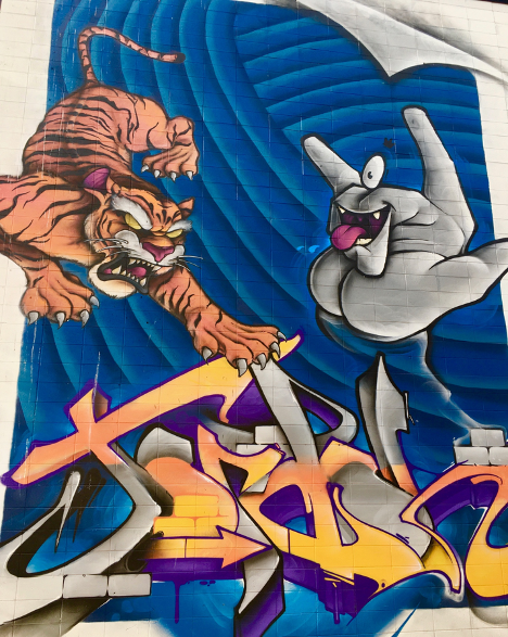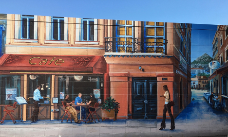A short walk south will bring you to Koutouki restaurant and a streetscape scene reminiscent of European sidewalk cafes. It’s 3D effects make you feel like you’re walking right into the mural. Kris Friesen’s orange classical buildings of Athen’s streets open up to create a colourful alleyway. Grab a coffee and sit down!